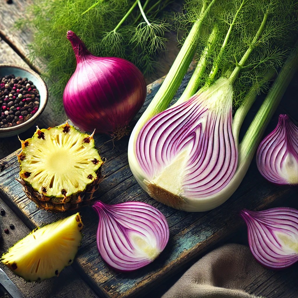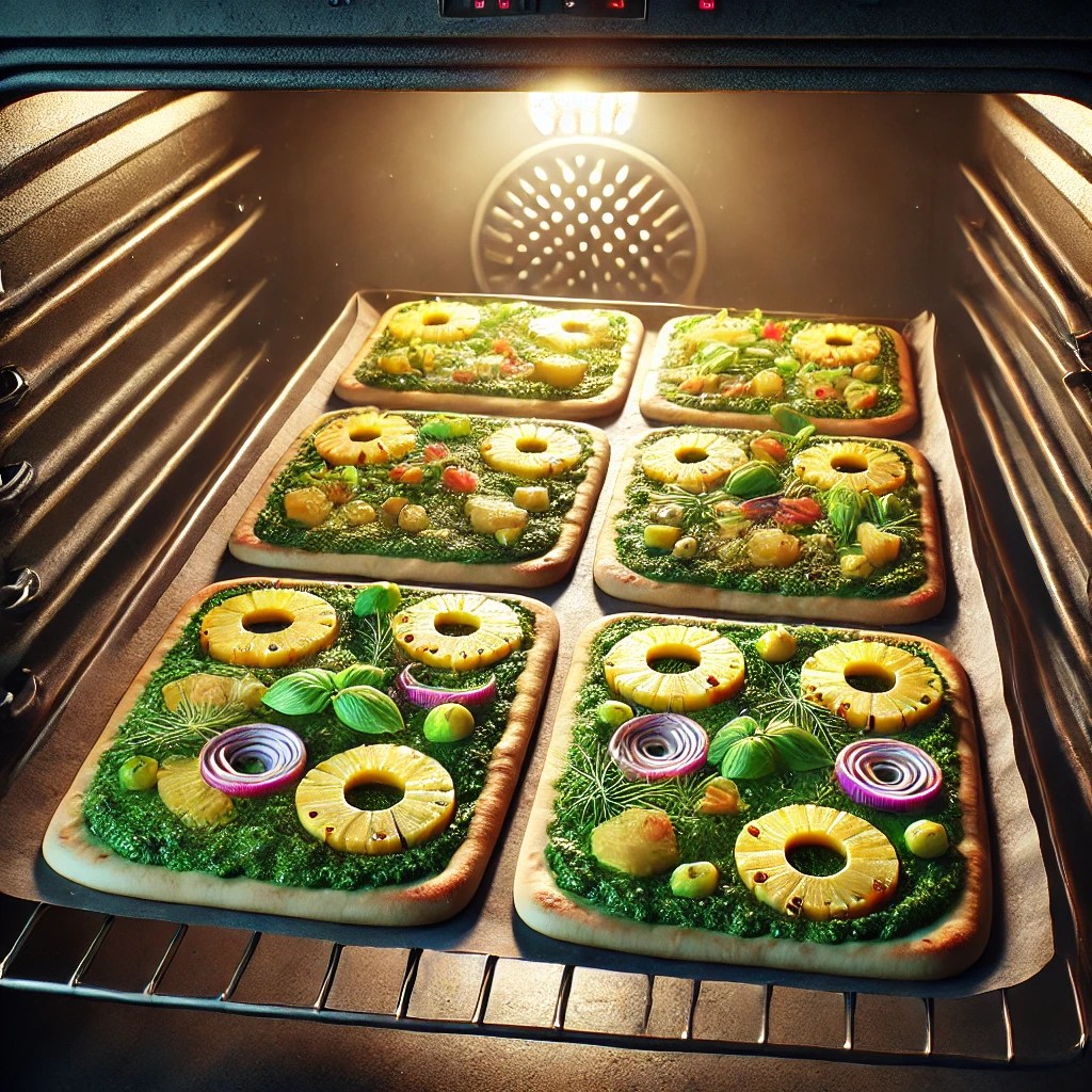 The Tropical Verde Flatbread is a unique blend of bold and refreshing flavors. A custom vegan basil pesto forms the vibrant base, layered with sweet pineapple chunks, caramelized onion, and delicate slices of fennel for a sophisticated twist. Each rectangular flatbread is finished with a generous sprinkle of nutritional yeast, adding a cheesy depth that perfectly complements the tropical and herbal notes. This flatbread is a true plant-based masterpiece, combining sweet, savory, and aromatic elements in every bite. Perfect as a light meal or an impressive appetizer to share!